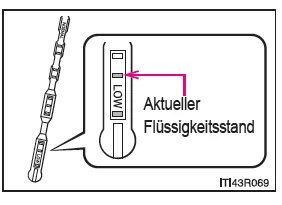 Um den Waschflüssigkeitsstand zu kontrollieren, stellen Sie fest, wo sich der Stand in den mit Flüssigkeit gefüllten Öffnungen des Messstabs befindet.